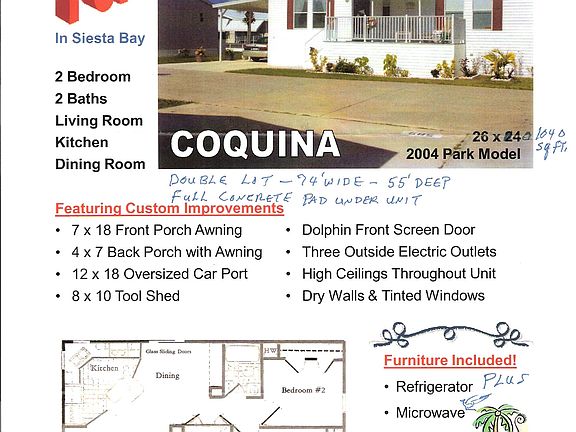 Furnished manufactured home in Siesta bay. Carport and storage shed. Upgraded appliances, furniture, flooring , and lighting. Move in ready. Premium lot. Easy access to three beach areas