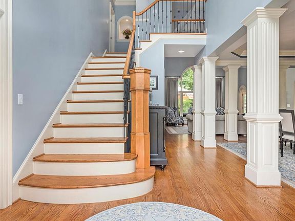 This gorgeous custom home in River Run with luxurious outdoor living space and open floor plan is perfect for entertaining all year round. Enjoy the inground pool with hot tub, built in firepit, grilling station with, refrigerator, storage and prep space. The recently expanded patio allows for plenty of space to entertain and relax. Renovated gourmet kitchen with island, SS appliances, and eating area opens to family room with fireplace and beamed vaulted ceiling. The living room has large windows with views of the pool, a gas fireplace, with a wet bar between the kitchen and living areas. The primary bedroom is on the main level with large ensuite bathroom that features a soaking tub. Two upper bedrooms all have ensuite bathrooms, one has shared bath. The large bonus room features a wet bar, built-in desk and cabinets. Private office/study with French doors on main level. Plantations shutters throughout the house. Kitchen Renovation 2020, Roof/Gutters 2017, HVAC 2018-2019.
