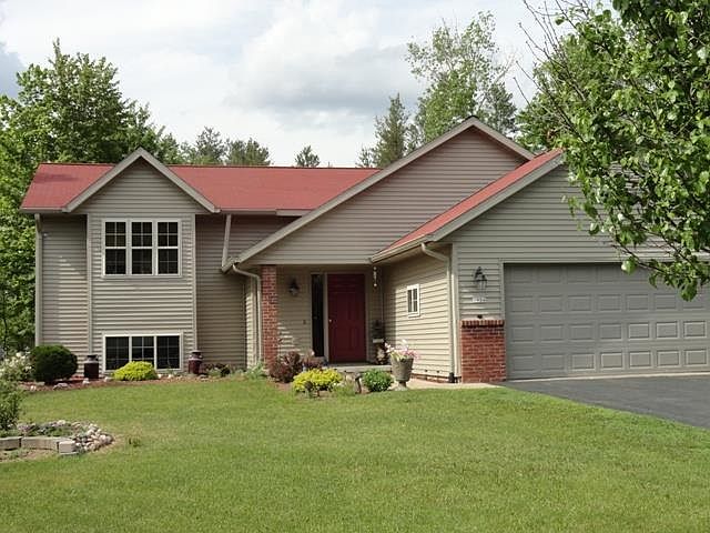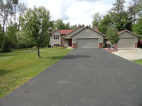 Maple cabinetry with large snack island compliments the gourmet kitchen with all new stainless steel appliances. An extra 4 feet was added to the length of the home to allow larger than usual living room and dining area. (open concept) Nicely landscaped, 1/2 acres very private wooded lot. Brand new additional garage and new back patio. New flooring and lighting.