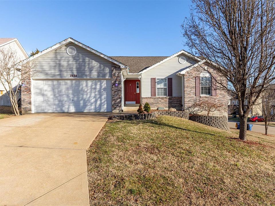 This one is a GEM in FEstus Schools! 4 bedrooms, 3 full baths and a wide Open Floor plan with hardwood floors and more! From the moment you pull up to this HOME on a large corner lot, you are impressed with the meticulous care given this home by the SEller. Inside and out it is move-in ready! Vaulted ceilings in the spacious Great Room, GAs fireplace, chair rail molding and gleaming hardwood feels warm and inviting. The spacious and oh-so efficient kitchen h as stainless appliances and loads of counter space, double pantry and center island with breakfast bar. Large dining area is big enough for a big table and a buffet or china hutch. Opens with a double slider to a stamped concrete patio in your private yard. The main floor has Master suite, and two additional bedrooms. The basement finish is underway! Will have a finished family room and a 4th bedroom and a full bath, and still a large storage area. In Award-winning FEstus schools, this location cannot be beat! It is home!