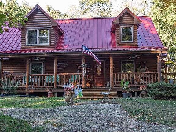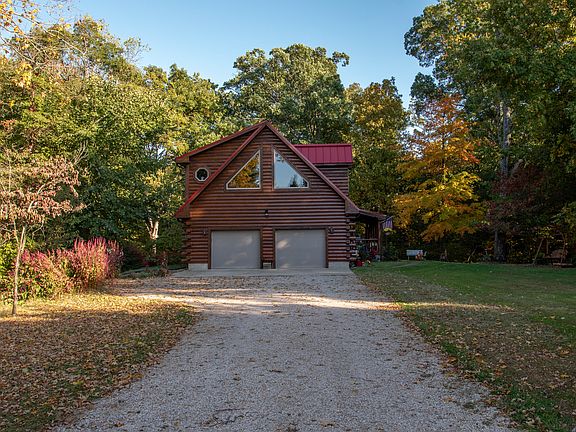 Beautiful lake side home on 3 wooded acres nestled by the 811 acre Mill Creek Lake. Elegantly decorated, this 2212 sq ft , full-log cabin masterfully utilizes red wood, cherry, hickory and red oak. Living room leads to a 272 square foot deck with awesome views. This story and half home features an upper master bedroom suite with balcony. Partially finished walkout basement with bedroom, bath and kitchen making a wonderful guest apartment making an additional 980 square feet of living space. 2 car attached garage. 27x30 pole barn. Municipal water. Lake frontage with new private dock.