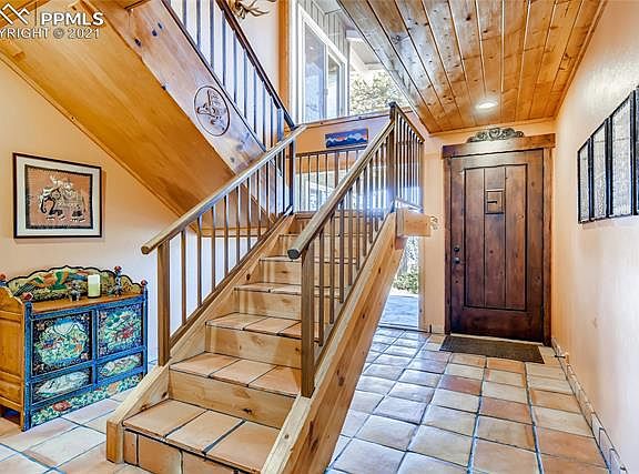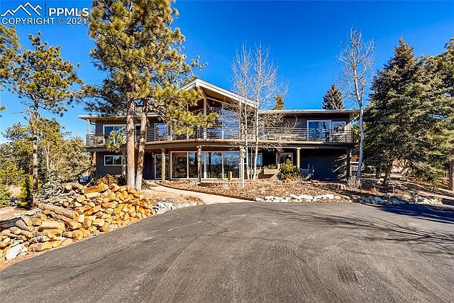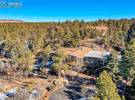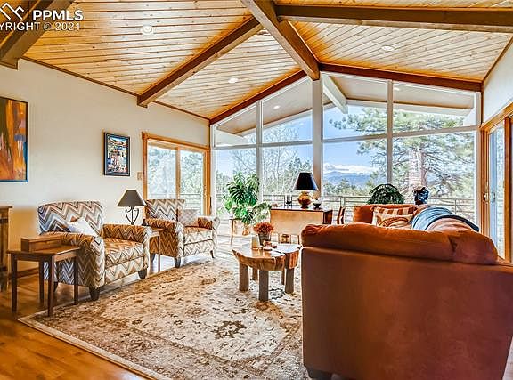 This Woodmoor custom home speaks Colorado Lodge. Situated on an almost 1 acre lot with panoramic view of Pikes Peak and the Front Range this home has custom woodworking throughout, new windows, new Andersen doors, a beautiful custom front door and tongue-n-groove wood ceilings with beams in almost every room that makes this home one-of-a-kind. The spacious vaulted living room with its wall of windows brings the views of Pikes Peak inside. The focal point of the living room is the dramatic two sided moss rock fireplace and divides the living room and the formal dining room with a walk out to the back deck. The master bedroom features access to the front deck with unobstructed views throughout and a spa shower in the master bath. This gourmet kitchen features luxury vinyl plank flooring, built-ins shelves, custom cabinetry, two ovens, a spacious eating area and another walk out to yet another deck. The den off the eating area boasts tons of natural lighting plus a walk-out to a private enclosed deck. So many extra features in this beautiful custom home to include reverse osmosis water filter, solid wood interior doors, dual furnaces, two fireplaces, multiple outdoor living spaces with a water feature, a heated 3-car garage with a wash sink, established garden and perennials beds, a hot tub and dont forget about those outstanding Pikes Peak views from nearly every room!
