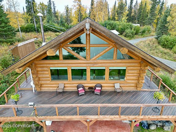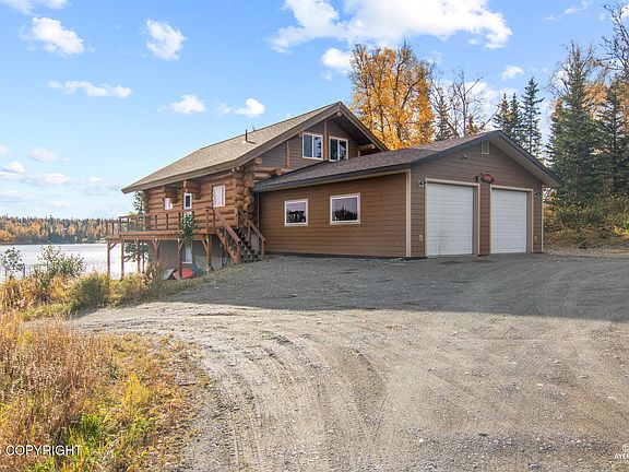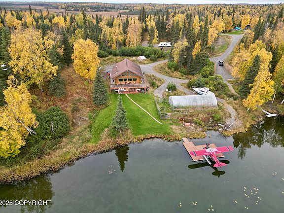 Welcome to your dream lakefront retreat! This stunning, custom-built scribed Tanana Valley log home, meticulously maintained by its original owner, sits on a floatplane lake stocked with trout. Truly a PILOT'S PARADISE! Both the home and the garage offer in-floor heating, ensuring year-round comfort. For aviation enthusiasts, the professionally constructed floatplane dock includes techno posts,treated lumber, and your own fueling station! Enjoy gourmet cooking in the beautifully appointed kitchen featuring Craft made soft-close cabinetry, quartz countertops, and premium stainless steel appliances. Experience breathtaking lake views through the expansive windows of the vaulted main living area, enhanced with warm tongue-and-groove ceilings. Custom powered hideaway stairs will bring you to the large loft area. The home's ambiance is elevated by real hardwood and elegant slate tile flooring throughout, while the cozy woodstove creates the perfect atmosphere for Alaskan evenings. Step outside onto the recently updated Trex wrap-around decking, ideal for entertaining and soaking in the serene lakefront setting. Green thumbs will appreciate the fenced high tunnel garden area and established cherry, apple, and apricot trees. The walk-out basement adds incredible value, featuring a large family room easily convertible to an additional bedroom, a bedroom, washer/dryer area, workshop/reloading room, ample storage, and a practical sink cabinet area. This exceptional property offers unparalleled privacy, beauty, and endless possibilities. Don't miss your opportunity to own this extraordinary Alaskan property!