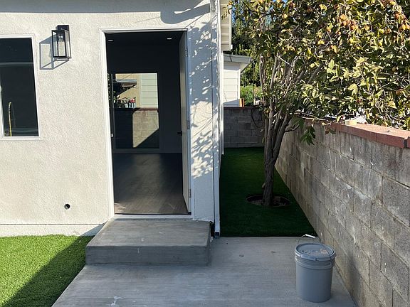 Modern-style kitchen with an open floor plan, with all new appliances. There is a new water system and hookups for the washer and dryer, which are available inside the unit. Includes new flooring throughout the home, with big sliding doors in the living room and master bedroom, which both have a beautiful view of the yard that is entirely covered with synthetic grass.
