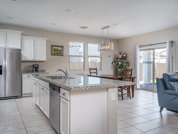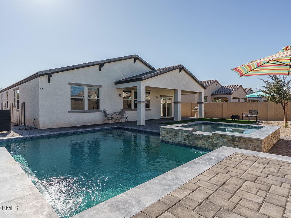 This original-owner home sits on an oversized lot and features 4 bedrooms & 2 baths in 1935 SqFt with a beautiful heated pool & spa in the backyard! The open great room layout is ideal for family living and entertaining. The kitchen has an abundance of white cabinetry with crown molding, granite countertops, stainless appliances, a pantry, and an island with breakfast bar. Sliding glass doors lead out to the covered paver patio and a great backyard featuring a heated pebble sheen pool and spa with stacked stone accents and sheer descent water features, artificial turf for kids and pets to play on, and only single story neighbors. The primary bedroom has an en-suite bath with dual sink vanity, oversized shower, and a walk-in closet. Two secondary bedrooms also have walk-in closets, and both baths have granite countertops. Other features include a spacious laundry room, tile floors throughout living areas and baths, carpet in bedrooms, and a 2 car air conditioned garage with service door and an extended paver driveway.
