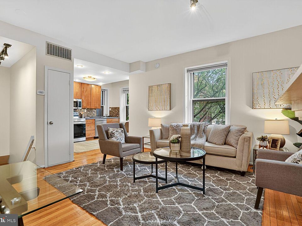 Welcome to this classic two-level Dupont condo which lives like a townhouse. Located in a boutique converted mansion 7-unit condominium, this stunning sunlit residence has two-bedrooms, 2.5 baths and two super outdoor spaces. The bright main level features hardwood floors throughout. The living-dining room has a decorative fireplace. The dining room has an office area at the window and French doors with glass panes open to a lovely wood deck for outdoor dining, entertaining, or relaxing. The eat-in kitchen features stainless steel appliances, tile backsplash, great cabinetry storage, and a picture window with treetop views of the leafy block. Back at the foyer entrance area find a half bath, coat closet and the carpeted stairs down to the bedroom level. At the base of the stairs is the other unit entrance from the hallway by the main building entrance. This floor offers two bedrooms and two full bathrooms. The primary bedroom features a walk-in closet, ensuite bath and glass-paned doors to the private Trex balcony above the front gardens. The second bedroom has garden views as well. Across the center hall is the second full bath and the laundry closet with a front-loading washer-dryer set. Nearby find endless dining, shopping, and entertainment options. Grocery stores, gyms, parks, Metro and more are just blocks away. This dynamic Dupont location is close to all the best of city living!