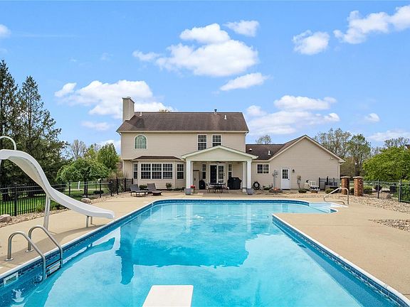 3,300+ finished sqft home: 4 bdrm, 4 bath on a private 1 acre lot with an inground pool! Foyer: hardwood floors that flow throughout the main level. Open 2-story foyer leads to a spacious office & dining room. Great room: large bay window, gas fireplace and opens to the kitchen, complete with abundant cabinets, newer stainless steel appliances, large island w/bar seating, granite countertops, and a pantry. Breakfast area: opens up to a covered patio overlooking the pool. Main level also features: laundry room, half bath and side load 3 car garage. Upstairs: 3 guest bdrms (one with wood flooring and double door entry), an updated hall bathroom, and a master suite with a walk-in closet, dual sinks, a soaking tub, and a separate shower. Basement: family/rec room, Bonus Room with a walk-in closet, a full bathroom, and lots of storage. Exterior: maintained and landscaped yard surrounds the inground pool, spacious patio, and gas firepit. Additional: Zoned HVAC, irrigation system.