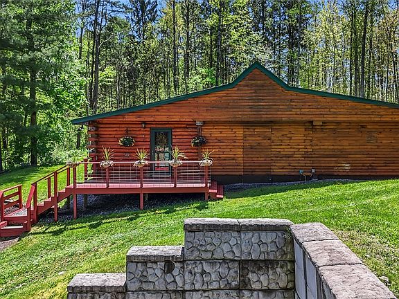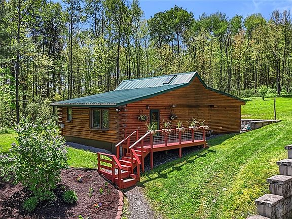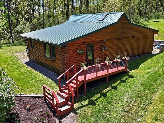 Nestled on 8.5 private acres in the sought-after Dryden/Virgil area, just 7 minutes from the heart of Dryden and Greek Peak, this charming log cabin offers the perfect blend of rustic character and modern comfort. Featuring a freshly painted front deck, vibrant landscaping, and a durable metal roof, the home is both welcoming and low-maintenance. Inside, you'll find warm wood-paneled walls and ceilings, one cozy bedroom, a versatile nook that can serve as an additional sleeping space or reading area, and a lofted upper level perfect for a home office or creative studio. Surrounded by mature trees and lush greenery, this serene retreat provides ultimate privacy while remaining conveniently close to town amenities, making it an ideal full-time residence, weekend getaway, or short-term rental investment.
