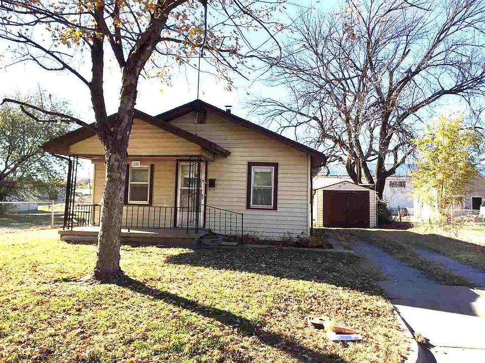 THIS PROPERTY SELLING IN A MULTI-PROPERTY AUCTION CONDUCTED OFF-SITE AT THE HOLIDAY INN (549 S. ROCK RD.) AUCTION DECEMBER 17TH AT 6:00 P.M. DOORS OPEN AT 5:00 P.M. FOR REGISTRATION, OR PRE-REGISTER ONLINE. 3-Bedroom, 1-Bath Bungalow home. Exterior features a partially fenced yard with detached garage and shed. Covered front porch with wrought iron railing. The interior has neutral colors throughout. Updates include a hot water tank and nearly all replacement windows. *Verify schools. The real estate is offered at public auction in its present, “as is where is” condition and is accepted by the buyer without any expressed or implied warranties or representations from the seller or seller’s agents. It is incumbent upon buyer to exercise buyer’s own due diligence, investigation, and evaluation of suitability of use for the real estate prior to bidding. It is buyer’s responsibility to have any and all desired inspections completed prior to bidding including, but not limited to, the following: roof; structure; termite; environmental; survey; encroachments; groundwater; flood designation; presence of lead-based paint or lead based paint hazards; presence of radon; presence of asbestos; presence of mold; electrical; appliances; heating; air conditioning; mechanical; plumbing (including water well, septic, or lagoon compliance); sex offender registry information; flight patterns, or any other desired inspection. Any information provided or to be provided by seller or seller’s agents was obtained from a variety of sources and neither seller nor seller’s agents have made any independent investigation or verification of such information and make no representation as to the accuracy or completeness of such information. Auction announcements take precedence over anything previously stated or printed. Total purchase price will include a 10% buyer’s premium ($1,500.00 minimum) added to the final bid. Earnest money is due from the high bidder at the auction in the form of cash, check, or immediately available, certified funds in the amount $3,500.