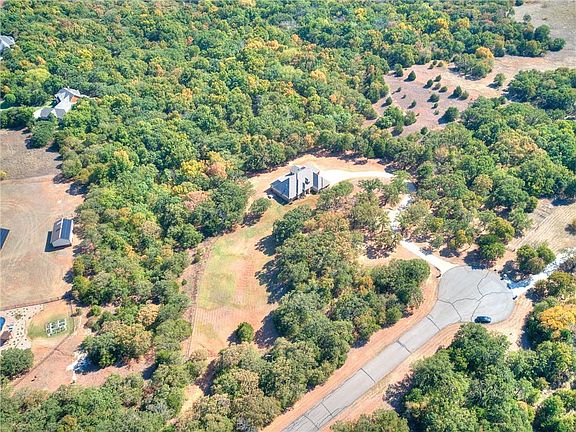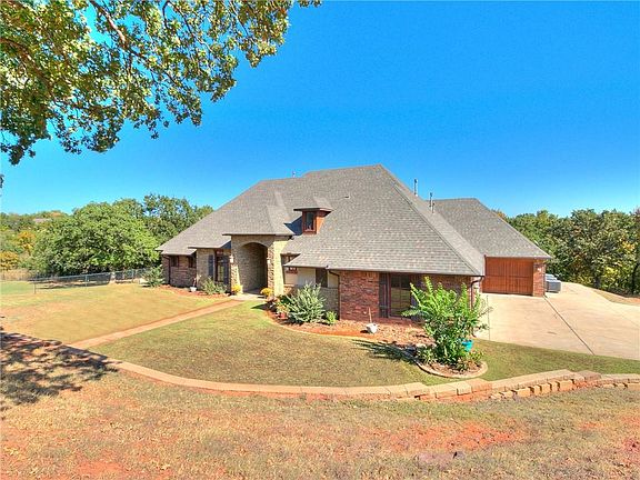 Beautiful rural retreat in the woods. A short drive out historic Route 66, past Lake Arcadia & the Round Barn to this gorgeous neighborhood of wooded acreages. Rural living just minutes from town! Located at the back of the neighborhood on a culdesac. Enjoy relaxing in the privacy of 11+ wooded acres w/huge fenced yard. Have gatherings & cookouts on the large east-facing covered porch. Sip your coffee as you watch the sunrise & wildlife from huge picture windows in kitchen & living areas. Create your favorite meals in the gourmet kitchen with gas stove, pot filler, & copper farm sink. Relax in the spacious owner's suite. Downstairs you will find owner's suite, study, spacious living area, 2 add'l beds, full bath, & half bath. Upstairs are media room, large bonus room, & half bath. Hardwood & tile floors throughout. Lots of storage everywhere! This is a gorgeous home with so much to offer. Propane tank filled. Septic tank cleaned out & sprinklers replaced. Horses welcome!