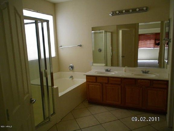 Remarkably clean and well maintained 3 bedroom 2 bath home with a split master bedroom and a greatroom floor plan. Kitchen has stone counter tops, built-in microwave, pantry, and fridge. Large master bedroom suite with separate shower and bathtub, double sinks, and separate toilet room. 4-inch plantation shutters on front windows, and diagonal cut 18 inch tile throughout the home, except in bedrooms. Laundry room has upgraded cabinets, plumbed for a sink and room for a 2nd fridge. Grass backyard with large raised planter. Queen Creek Schools (A Grade). Close to restaurants and shopping.