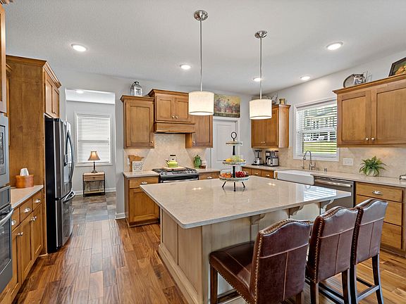 This stunning home features a first-floor apartment suite with a separate entrance, living room, kitchen, bedroom, bathroom, laundry, & garage. The main home features a wide open plan with high-end finishes throughout. Kitchen includes slate appliances, shaker cabinets, quartz countertops, stone backsplash, & walk in pantry. Other main level highlight: floor to ceiling stone fireplace, mudroom boot bench, walk-in storage closet, & a beautiful sunroom that walks out to a custom paver patio w/ a built in pergola. Upstairs find a large master suite with a luxury bathroom w/ heated floors, quartz countertops, & a large walk-in tile shower. 3 additional bedrooms are upstairs all w/ walk-in closets, jack & jill bath and a princess suite, and a huge laundry room w/ a built-in sink and cabinets galore. Downstairs is equally as impressive with another floor to ceiling fireplace, custom bar, an additional bedroom, and over 500 sqft of unfished storage space!