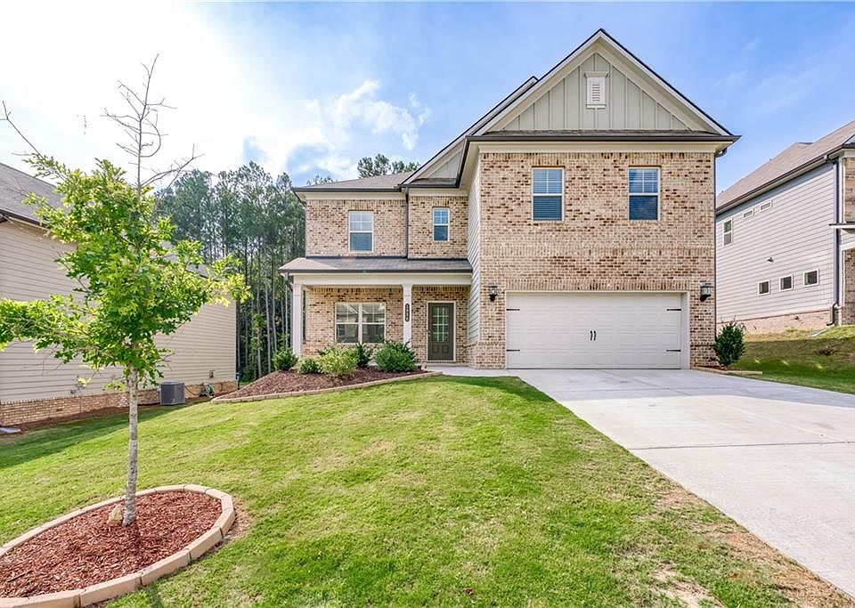 This 2-year-old property, located in the coveted Mill Creek High School district, offers 5 bedrooms and 4 baths, including a main floor guest suite and an upstairs loft. Notable features include a welcoming front porch, an elegant entry foyer leading to a formal dining room, and an open great room with a coffered ceiling that seamlessly connects to the kitchen. Practical amenities such as a mudroom and a spacious walk-in pantry enhance daily living, while the kitchen showcases a stunning giant marble countertop. The breakfast room opens to a substantial covered patio, perfect for relaxation and entertaining. Upstairs, a versatile loft with glass doors serves as an ideal office space. The primary suite offers a tray ceiling and a luxurious bathroom, and there are three additional bedrooms, two full baths, and a laundry room on the second floor. One secondary bedroom enjoys its own full bathroom, while the other two share a bathroom. Additional perks include a thoughtfully painted garage floor. The property backs up to a wooded area for extra privacy. This property is nestled in a peaceful neighborhood and enjoys convenient proximity to shopping and the I-85 highway.