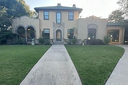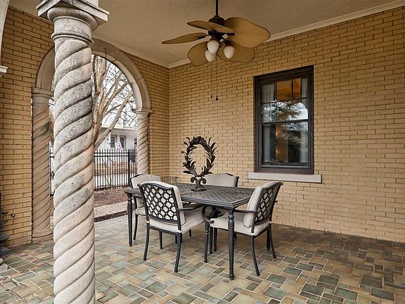 The JA Ingram mansion, built in 1929, mesmerizes with its Spanish Colonial architecture, elegant archways, and a classic tile roof. Inside, hardwood floors and arched doors enhance the home's inviting warmth. The living room features exquisite hand-carved plaster ceilings, crown moldings, and a cozy gas fireplace, while the dining room mirrors this elegance with similar ceilings and a charming French-style doors. The updated kitchen blends historic charm with modern marble countertops and stainless appliances. On the main floor, there are two spacious bedrooms adorned with crown molding, stackable laundry, and ample storage. Both updated bathrooms merge historic allure with contemporary functionality. A lovely staircase leads to the second floor, home to an oversized bedroom and a stunning Great Room highlighting a second fireplace. Above the three-car garage, a quaint apartment features an updated bathroom. The backyard, with an open patio and hot tub, is ideal for entertaining.