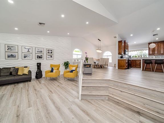 Breathtaking fully renovated lakefront pool home w/ open floor plan & vaulted ceilings. 1 bedroom and full bath on 1st floor. Amazing accent wall in living room. Lots of natural lighting and open concept living area, formal dining room, Chef's dream kitchen with views of pool & lake. Tasteful Quartz countertops with a beautiful island perfect for gatherings. Enjoy an outdoor kitchen with KitchenAid grill, by the completely renovated pool & spa overlooking the lake with stunning sunset views. All Impact Windows, new diamond Brite, marble pool deck, new floors, 3 tastefully renovated bathrooms, stunning views from Master balcony, located on cul de sac. 2 car garage w/ office space. A+ rated schools, Community Clubhouse, Fitness Center, Pool, Pickleball & Tennis. 24Hr guard gated community