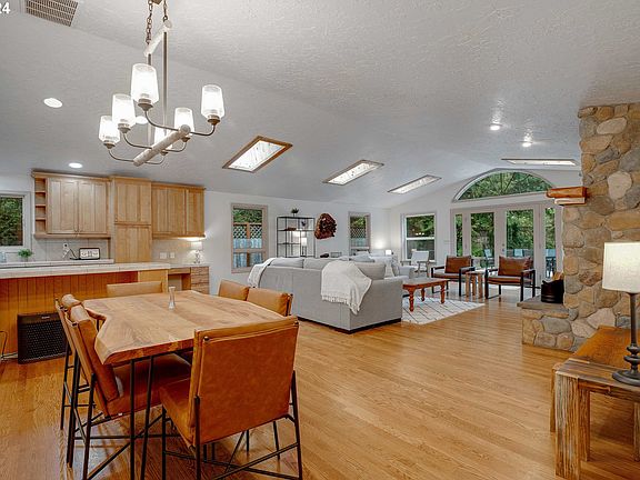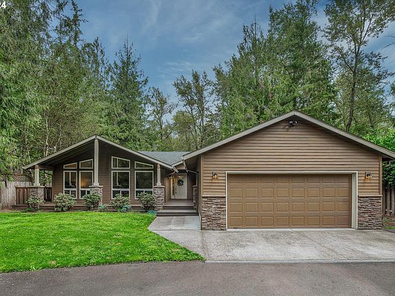 Nestled on nearly an acre amidst towering cedars, maples, and pines, this serene riverfront property invites you to step back to simpler times. Enjoy direct access to exceptional steelhead and salmon fishing only a few steps from your back door in the Sandy River, or unwind on the plush moss-covered rocks at the end of the private path, and let the soothing sounds of the rapids wash over you. With no back neighbors, a jaw dropping private deck, and a hot tub, nature watching or stargazing couldn’t get more luxurious. Cozy up by the fireplace and enjoy this open-concept layout, complete with four skylights, and a captivating view of the pristine woods. Or step through the barn door to the front room and look out the majestic windows to the fully fenced front yard, complete with Japanese garden at the center of the generous circular driveway, and savor a glimpse of the wildlife that call this lush landscaping home. With ample space for your RV, and a location just under 25 minutes from the slopes, this spot perfectly blends tranquility with adventure.Convenience is key with Hwy 26 and the Mount Hood Express nearby, offering easy access to Sandy, Rhododendron, and Government Camp. You can even walk to local favorite eatery Ivy Bear Pizza and visit the World’s Tallest Topiary Bear. Experience the ideal fusion of modern comforts and natural beauty in this picturesque setting. Heated floors in primary bathroom. Garage Attic has tongue and grooved plywood for ample additional storage space. All Appliances, hot tub and furniture can stay minus a small list of exclusions.