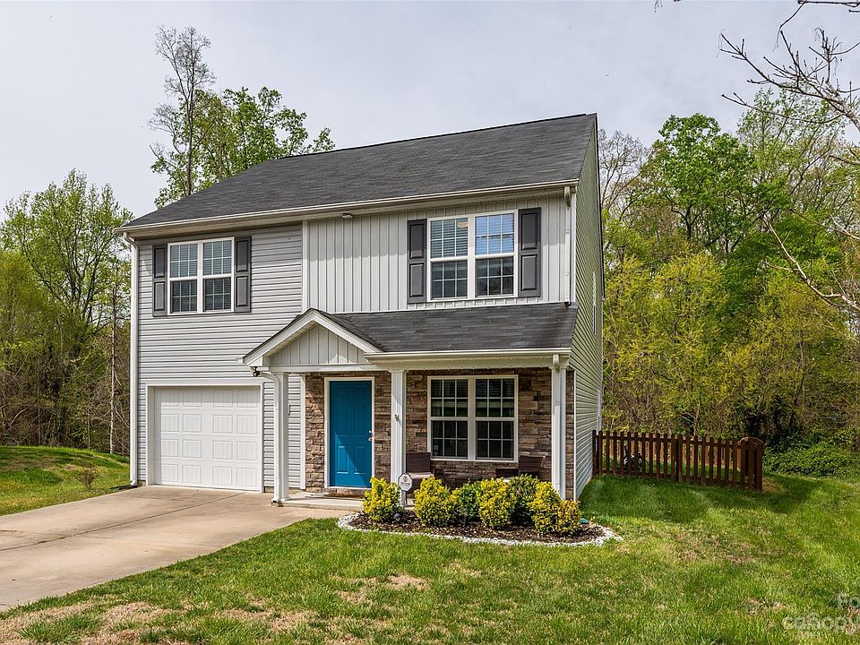 Fabulous cul-de-sac home within minutes to uptown! This 4BR 2.5BA home welcomes you with a friendly front porch, and enter to find gorgeous LVP flooring downstairs and up! Sunny living room with bay window, leading you to the open kitchen/dining/family room! Kitchen offers ample counter space, gas stove+microwave, stainless, big pantry. Large family room with gas logs, big windows for natural light, spacious dining area with modern lighting. Upstairs find four wonderful bedrooms and don't miss the great closet space in each! Vaulted primary ensuite with dual vanity, large garden tub/shower combo. Fenced backyard perfect for your two or four legged friends, and backs to woods for complete privacy. Garage will fit your car and/or all of your toys! Quiet neighborhood with easy access to I-77 and I-485. Close to town without the noises of living in the city!