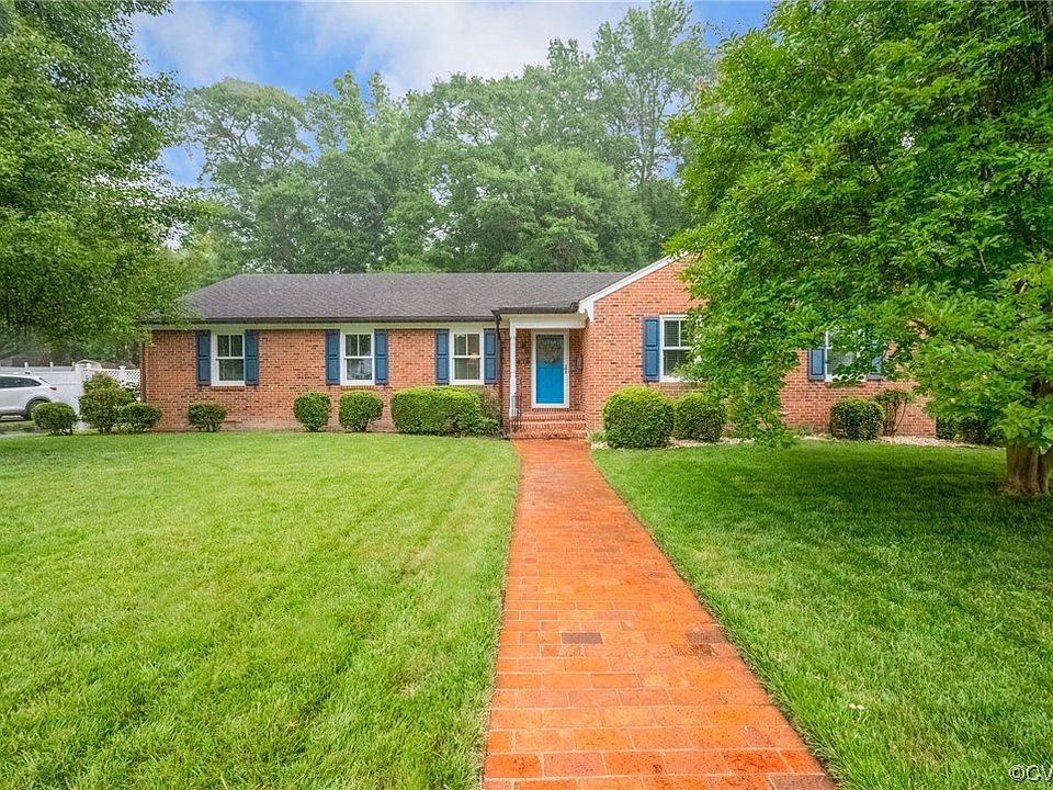 NOT YOUR AVERAGE BRICK RANCH HOME IN WALNUT HILL! This home is an incredible mix of classic and current. It begins with the brick paver walkway leading to the covered front porch. Inside, you will find a large living room plus a large formal dining room with crown molding and chair railing, hardwood floors throughout the home, a comfortable family room with a brick fireplace, a renovated eat-in kitchen with quartz countertops and a commercial sized range, and 3 generously sized bedrooms including a massive primary bedroom complimented with its own ensuite bath. One completely renovated bathroom features a massive marble shower, marble flooring, and new fixtures. The delightful, screened porch overlooking the landscaped yard is perfect for enjoying a cup of coffee or dining alfresco. This home comes equipped with a 50-year dimensional shingled roof, a newer heat pump and ductwork (both in 2017), copper gutters, paved driveway, oversized 1-car garage with loads of storage, drain tile around the entire perimeter of the home, crawl space with a vapor barrier, dehumidifier and sump pump system, and an upgraded 200-amp breaker box. Just 7 minutes to Fort Lee 25 minutes to Richmond!