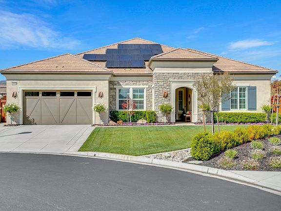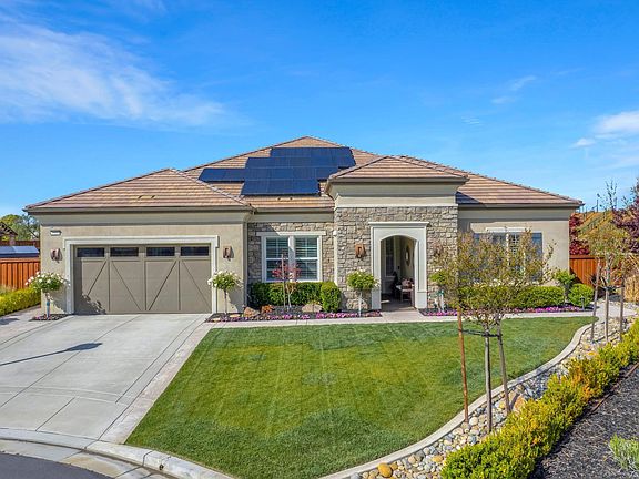 Welcome to 1937 Decanter Circle, a breathtaking single-family home located in the gated community of Lark Hill. This 3334 sq. ft. residence sits on an expansive 17,000 sq. ft. pie-shaped lot, offering privacy and stunning vineyard views. Step inside to discover wood floors throughout, with plush carpeting in the bedrooms for added comfort. The chef's kitchen is a true showpeice, featuring quartz countertops, extended custom cabinetry, a stylish tile backsplash, & top-of-the-line Monagram appliances, including a side-by-side refr./freezer, range cooktop, built in oven and micro. A spacious pantry ensures ample storage. The open-concept living area seamlessly connests to the California room through fully retractable sliding doors, blending indoor and outdoor living effortlessly. Outside, your private oasis awaits - a sparkling pool, expansive concrete patio, lush grass, a garden/orchard area and even a bocce court. Entertain in style using your outdoor kitchen featuring granite countertops and seating for eight. The master offers access to the back yard. The spa like master bath offers a large soaking tup, extensive cabinetry & a custom built in closet with laundry hamper & ironing board. Also included, 18 owned solar panels, storage shed & finished garage with built ins.