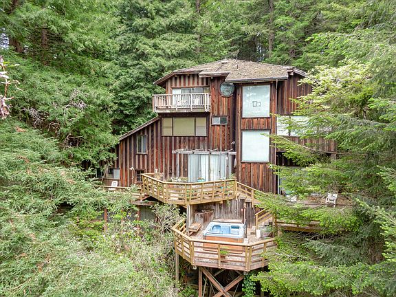 Absolutely stunning architectural masterpiece, big beautiful redwood beams throughout. The home is nestled amongst the redwoods with a well thought out circular driveway for easy access. Over 3,500 square feet of living space spread over three levels with views of the trees from every window. The first level has a large partially sunken living room, kitchen, dining area, walk in pantry and half bath. Level two has an office, bedroom, full bath and laundry room. Level three has the primary ensuite, a large walk in closet, 'wet room' and balcony nook. There is a small ensuite 'studio' tucked into the eaves and accessible from its own raised walkway. Do not go past any posted caution tape, there are unsafe areas of the decking.