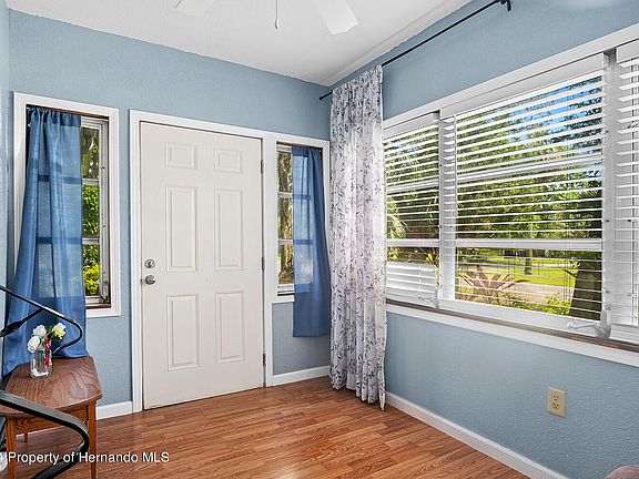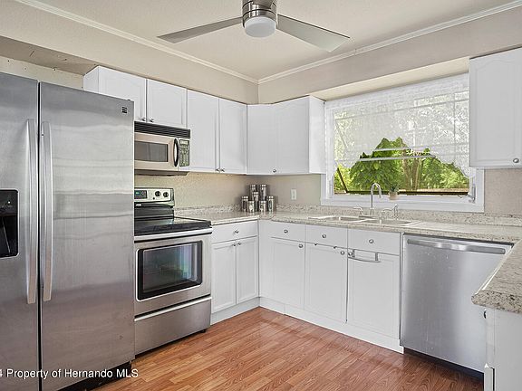 Discover this stunning gem before it's too late, nestled in the heart of Brooksville, mere steps from all conveniences, this residence boasts a welcoming and efficient layout, bathed in natural light from windows in every room. Upgrades include a new roof and Septic from 2017, air conditioning units, and ceiling fans. The master bedroom now features a remodeled walk-in closet, while a second closet has been added to the second bedroom. The spacious kitchen is a dream for organization, thanks to newly installed cabinets. It's equipped with a stainless steel microwave and stove, and for those who dislike carpet, rejoice! The entire home sports wood and tile flooring. Even the laundry room has seen an upgrade with new cabinets. Both the interior and exterior of the home have been recently painted. The Carport has been screened in creating a convenient screen in Lanai to enjoy the Florida Weather in comfort. The backyard is a luscious oasis with a Dual Gate Side entry allowing plenty of space for a trailer, or boat storage. And RV hookups for an RV are also available electric & sewage. All of this sits on a generously sized .43 Acre Corner Lot. Don't miss your chance to see it!
