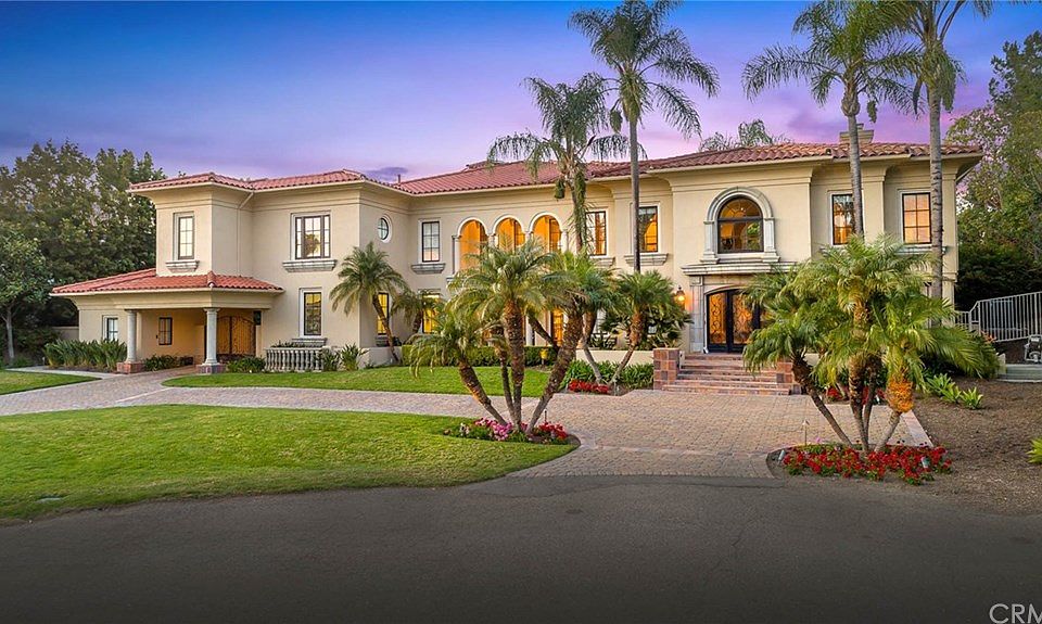 One of the most spectacular estate homes in north Orange County! Located on nearly 1.2 acres, this private, gated tennis estate with guest/pool house, numerous outdoor amenities, timeless architecture and meticulous interior of the highest quality finishes. An entertainers dream with indoor-outdoor living areas that flow seamlessly for groups of any size. Massive iron doors open to a grand entry of soaring ceilings, curved staircases and towering windows overlooking the resort style oasis including sparkling pool, elevated spa, waterslide, outdoor loggias, BBQ, lighted tennis court, putting green, fire pit and guest casita with kitchenette. Formal dining room with 2 story ceilings, piano alcove and elegant office. Wide plank, hardwood floors and Travertine completes the flooring. A remodeled gourmet kitchen with 6 burner Wolf, stainless hood, Sub Zero refrig and Quartz countertops. A center island and dining nook completes the area. Adjacent is a covered loggia and family room with towering ceilings and windows, marble fireplace, media center and full wet bar. A main floor guest suite w/ bathroom and 2 powder rooms. Ascend the curved staircases to a separate guest wing or toward the family wing complete with 2 spacious secondary bedrooms separated by a media lounge. The master suite offers a private retreat, fireplace, covered loggia, coffee bar and renovated bathroom of Carrara marble including a walk-in shower, soaking tub and skylight. His and hers custom closets and a gym