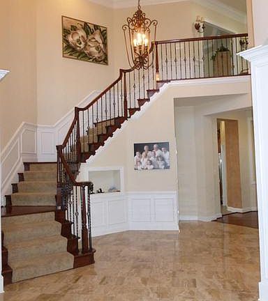 Spacious Centex Cambridge Model Home. Upgrades galore! Marble foyer, granite, huge bump-out, beautiful hardwood flooring, gourmet kitchen, and a library with custom built-ins. Over 130 recessed lights throughout, all windows tinted, 10 ceiling fans and custom two-story stone FP.