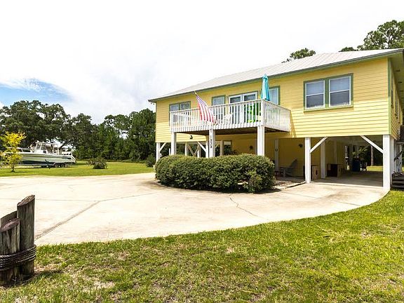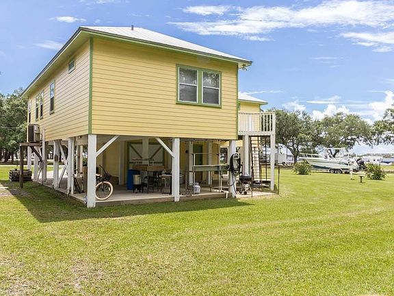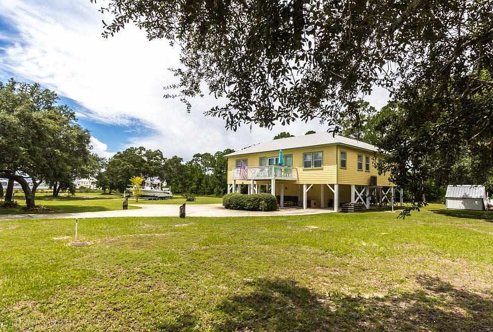 AMAZING VIEWS! New AC placed in August 2018. This 3bedroom 2 bath raised beach cottage has an open and airy floor plan, large kitchen with custom cabinets, and plenty of room for the whole family! Located minutes from the beach (approximately 4 miles). Come enjoy the beautiful sunsets on your 2 large decks, both overlooking the Lagoon. Large lot surrounded by beautiful fruit and oak trees with a well and sprinkler system. There is also plenty of room for the boat and all the water toys. The downstairs has lots of storage for the beach toys and an amazing workshop or man cave. The home comes with 1/22 interest in lot 7 & 8 on the lagoon.