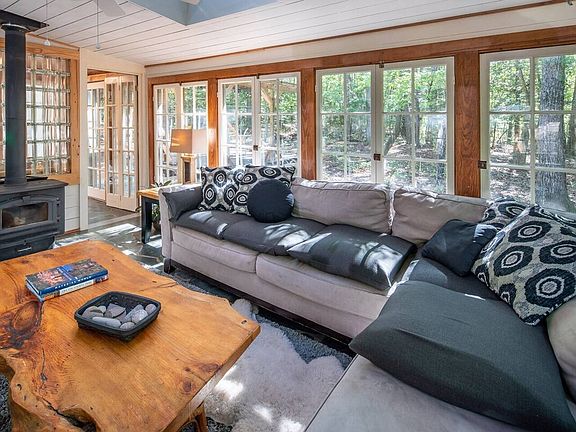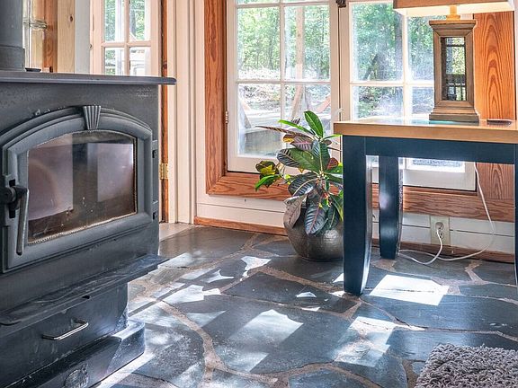 This quirky, multi-level ecological house is perfect for a getaway in the great outdoors, set on 5 wooded acres with covered terraces for al fresco dining. Enjoy giant picture windows, a wood-burning stove, and a fire ring with firewood provided. Located just 15 minutes from Chapel Hill, UNC Memorial Hospital, Saxapahaw, and Pittsboro, this home offers a unique retreat. The house is described as cozy and super charming, with an abundance of windows and great art that make it feel warm and inviting. It features original mosaics, wood and slate floors, and a wood stove for cold days. The kitchen is fully stocked with pots, pans, spices, cooking oils, and more, including a gas stove with 4 burners, an oven, microwave, and toaster oven. A full fridge and freezer are available, along with a French press for coffee, blender, and magic bullet. Organic coffee, half and half, and a selection of teas are also supplied. Well-behaved pets are welcome with a $50 fee per pet per stay. Unauthorized pets will incur a $200 charge. Attractions nearby include Franklin Street (9.6 mi), Kenan Stadium (10.4 mi), and The Barn at Valhalla (7.5 mi). For dining, Saxaphaw General Store Cafe is 11.7 mi away, and The Mod in Pittsboro is 12.8 mi away. Grocery options include Lowes Foods (8.5 mi) and Harris Teeter (9.6 mi). The property is also conveniently located near hospitals such as UNC Hillsborough Campus (18.2 mi) and UNC Children's Hospital (11.9 mi). The property has an outdoorsy feel, and guests may encounter squirrels, birds, and other wildlife. Summertime may bring bugs inside, and cobwebs can appear overnight. The home uses natural pest management and is chemical and fragrance-free. Caution is advised for older and physically challenged guests due to stairs and multiple levels. The only bathroom is upstairs. Unauthorized pets will be charged $200.