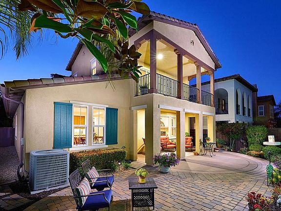 WOW! End of cul-de-sac location with views in highly sought after La Costa Greens! Step inside to wood flooring, plantation shutters, recently painted interior, and more! Living room/optional office plus family room with cozy stone fireplace. Open concept kitchen features granite countertops, tile backsplash with picture frame accent, stainless steel appliances, upgraded cabinets, island with bar seating, and breakfast area. Upstairs features a built-in desk area with a custom beaded glass window. Spacious primary suite with upgraded marble countertops & travertine in bath, walk-in closet, and peaceful views from private balcony. Secondary bedrooms have a jack & jill bath with upgraded tub & tile surround. Laundry room with sink & additional storage closet. Oversized attached two car garage. Low maintenance landscaping & pavers in the front & backyard. Gorgeous hillside & canyon views! Residents of La Costa Greens have the exclusive use of "The Presidio" and its resort style amenities, including a community pool, tennis courts, workout & recreation room. Convenient to Legoland, shopping, entertainment, and easy drive to North County's best beaches! Carlsbad School District! LIVE THE RESORT LIKE LIFESTYLE OF LA COSTA GREENS!