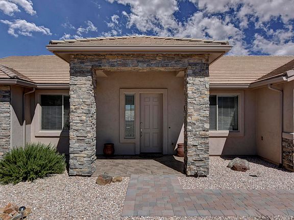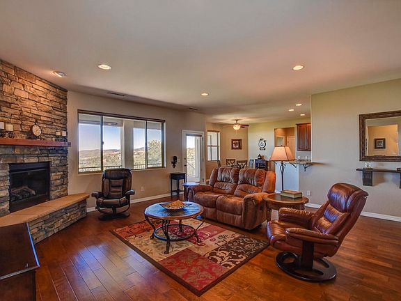 VIEWS! VIEWS! VIEWS! Possibly the best views to be had in Prescott! From the Peaks to the "P" including Mingus Mountain, Prescott Lakes Golf course, the lakes and Granite Dells, this fantastic single level 2089sf home enjoys those views and features three bedrooms, two baths plus an office and formal dining or study/den. Interior features include a corner raised hearth rock fireplace, engineered wood flooring and granite kitchen counters. Stucco and stone construction w/concrete tiled roof, pave stone driveway leads to a 3-car garage. Spacious 384 sf covered deck extends living to fully enjoy dramatic views where you can watch clouds sail across the sky. Stairs take you to the lower backyard with a flagstone patio for entertaining. No HOA makes this the easy choice for hassle-free living.