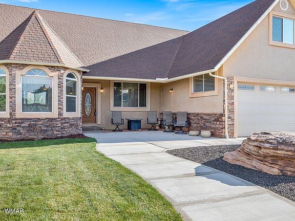 Large custom home with great views front & rear from a private lot! The main floor benefits from a large living room w/wood burning f'place, formal liv/rm, w/Temple views. Spacious eat in kitch with hard surface counter tops, newer stove & sink, large walk in pantry. An extra dining area off the kitchen. Spacious master down, and unique Jack & Jill set up in the 2 guest beds, each bed w/private toilet and sink and shared step in shower, ideal for mother in law q'ters or teen rooms. Upstairs consists of a full bath with 3 large bonus rooms/beds. The large game room has a built in sink & fun climbing wall. Don't forget to check out the huge mostly concreted storage area under the home. RV parking w/sewer clean out. Seller is offering 1% of the sales price for buyer to buy down interest rate Oversized garage. Close to the Snowflake bike park. Peach, Apple & Cherry trees, raised garden beds in large back yard. RV parking w/sewer clean out. Photos were taken when seller still lived in the home, it is now mostly vacant.