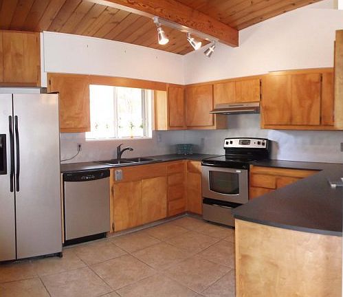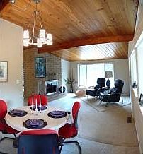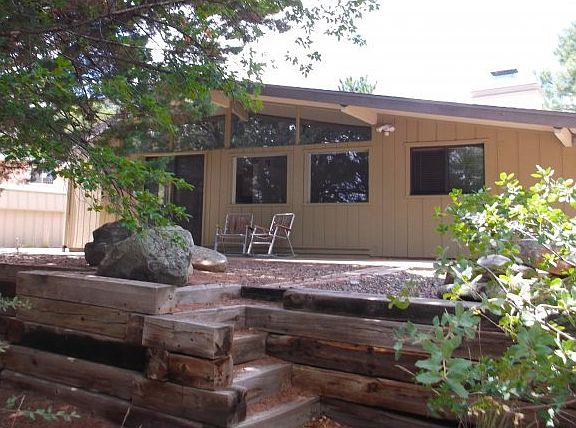 Surprising interior awaits as you enter this low maintenance, Mid-Century modern, nestled in the tall pines & boulders minutes from Thumb Butte & downtown. 1 level home; significantly renovated in 2008-stainless appl, counters, flooring, lighting, doors, new gas pack & AC in '05, new roof in '99. Vaulted tongue/groove ceiling, flr-to-ceiling stone fireplace, windows galore to enjoy blue sky. Huge level lot. 2 patios. Room for play area, RV/trailer parking or adding onto home. Note: baths are 1&3