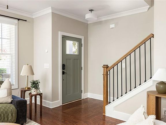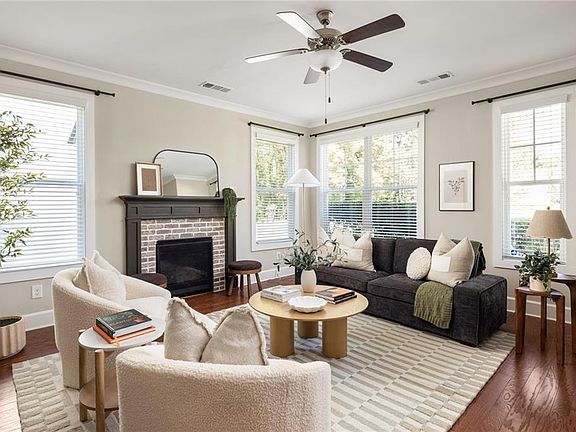 There’s something about this house that feels different the moment you turn onto the street. Maybe it’s the way the red maples out front frame the drive like a welcome home. Or how the charcoal siding and brick detailing feel timeless yet fresh. A quiet confidence that hints at what’s waiting inside. Enter through the front door and you’ll feel it immediately. That mix of warmth and calm that only a thoughtfully designed home can create. The living room greets you with soft natural light, wide-plank hardwoods, and a brick fireplace that anchors the space with a sense of history and heart. Arched doorways give just a hint of old-soul character, guiding you from one inviting space to the next. The dining room offers a moment of surprise. Deep-toned wainscoting, a ruffled blush chandelier, and the kind of cozy sophistication that makes even a Tuesday dinner feel like something special. The kitchen that follows is bright and balanced: crisp white cabinetry, glossy sage tile that shimmers in the morning light, quartz countertops, and a generous island that becomes the heart of the home. Perfect for lingering over coffee or late-night conversations. Even the everyday spaces have been designed with care. The laundry room pairs custom cabinetry and playful vintage wallpaper with patterned tile that reads: Dirty Clothes, Clean Conscience. Because even chores deserve a little charm. Upstairs, the primary suite feels like a deep breath. Navy walls wrap the room in serenity, while a private balcony offers the perfect spot for your morning coffee or a glass of wine under the stars. The ensuite bath is bright and elegant with dual vanities, a soaking tub, and glass shower. Outside, the story continues. The fenced backyard unfolds like a small, private garden. A mix of beauty and bounty. A fig tree, peach tree, pear tree, and pomegranate tree grow alongside blueberry and blackberry bushes, while a tidy herb garden fills the air with rosemary and lavender. There’s a covered patio for long summer dinners, open grassy space for play or pups, and the comforting feeling that this yard actually lives with you. It’s hard to believe you’re just minutes from East Atlanta Village, Ormewood Park, and downtown Decatur. Close enough for a night out at Argosy, a Saturday morning at the farmers market, or oysters and cocktails at Kimball House, but far enough away to come home to the quiet hum of crickets and the scent of blooming herbs. At 1939 Yellow Finch Trail, every space tells a story. One of intention, creativity, and the kind of comfort that lingers. This isn’t just a house; it’s a home that makes you feel something.
