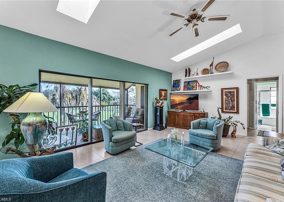 Exquisite 2nd floor Fairway Oaks Condo featuring cathedral ceiling with skylights that brighten the spacious open concept living/dining area. The condo has neutral large square porcelain tile floors and neutral palette furniture. Split bedrooms offer privacy and each bathroom has a newer vanity. The tile floor screened lanai looks onto the 1st fairway of the Pines Golf course and the lake with water feature. The kitchen is neutral with plenty of space for breakfast table and chairs. Oversized 1 car garage has plenty of extra storage space. Fairway Oaks is a partner of the Glades Golf & Country Club and enjoys all the amenities such as 2 Gordon Lewis designed golf courses that have been renovated with new irrigation and paspalum grass and landscaped in sustainable Florida plants and trees. Other amenities include, 9 swimming pools, New Pickleball Courts, New Tennis Courts, Bocce courts, shuffleboard, 19th Hole Restaurant, Pro Shop, and much more all just 10 minutes from downtown Naples finest restaurants and boutique shops and of course the Naples finest beaches. Furniture is considered not to have value and is being left as a courtesy of the seller.