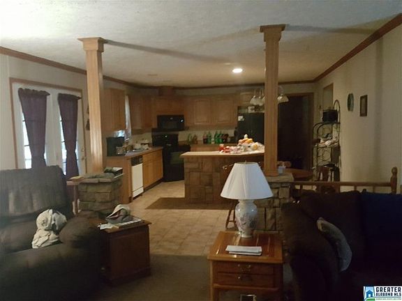 Nice double wide mobile home with open floor plan. 3 Br, 2 bath, front and back porches, large carport, outbuilding, 1 acre lot. Extra large master Br and bath; jetted tub, separate shower, double vanities, water closet, two walk in closets. 2 large bedrooms with walk in closets. spacious kitchen with lots of cabinet space, utility room with closet and pantry. Huge great room with stone fireplace, stone columns and stone wrapped island. beautiful trim work including crown molding throughout.