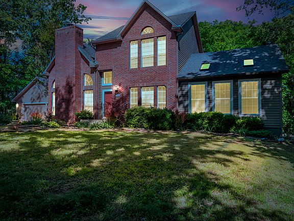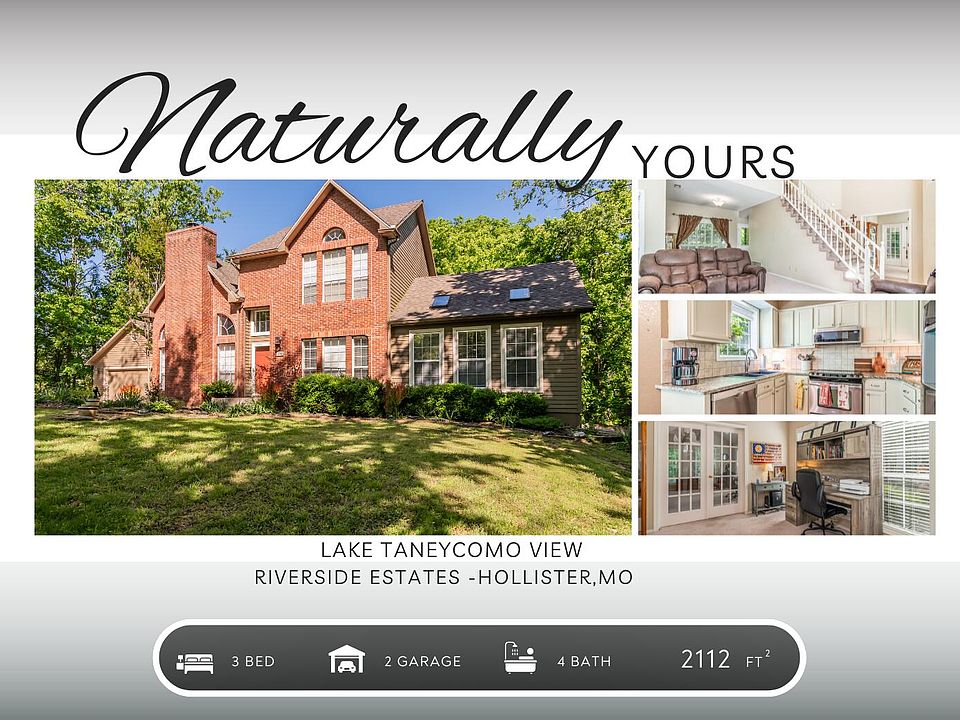 Welcome to Riverside Estates, where this elegant brick home sits nestled among the trees at the end of a peaceful cul-de-sac. Designed with comfort, character, and nature in mind, this 2-story residence offers a perfect blend of refined living and serene surroundings.Step through the front door into the impressive Great Room, where soaring ceilings and a wood-burning fireplace create a cozy ambiance ideal for fall and winter evenings. Natural light pours in through large windows, while French double doors open to a flexible office/library space. Beyond, you'll find a second living area with vaulted ceilings, skylights, and more stunning windows that bring the outdoors in.A beautiful staircase leads to an open landing overlooking the Great Room, where you'll find two upstairs bedrooms--each featuring its own private ensuite bathroom. The thoughtful layout and architectural touches enhance the home's sense of space and sophistication.The kitchen is equally inviting, with granite countertops, rich wood cabinetry, ample storage, and large shelves in the pantry. Whether enjoying casual meals in the breakfast nook or hosting gatherings in the formal dining room, this home offers the perfect setting for every occasion.Step outside to the covered back deck and discover your private outdoor retreat. Enjoy peaceful mornings and evening sunsets while surrounded by nature, and in the cooler months, take in glimpses of Lake Taneycomo through the trees seasonly. With deeded lake access, you can fish or boat just a quick drive around the community. The home also features a detached 2-car garage connected by a covered breezeway, a fenced backyard ideal for pets, and low-maintenance brick and wood siding.Located close to College of the Ozarks, Branson's entertainment district, shopping, restaurants, and public marinas, this property is the perfect blend of nature and convenience. Naturally Yours - this home is waiting to welcome you to the lake life & fishing