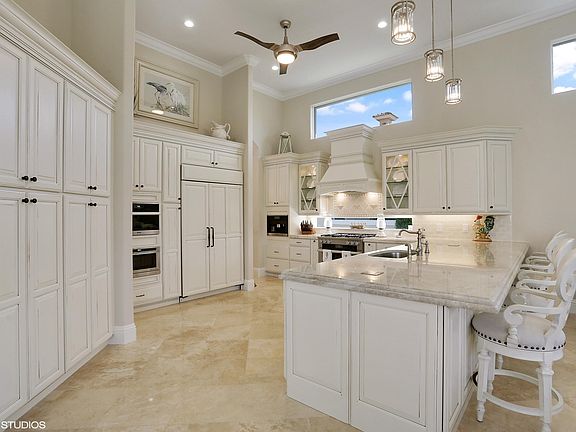 One of the best locations in Jupiter Country Club, with fabulous lake and preserve views, this Estate Home is located at the end of the cul-de-sac, bordering Riverbend Park by an Estuary, allowing extra space and privacy. In addition to the 5 bedrooms with 5.3 baths and 3.5 garage spaces, this home has a library/office and loft and has been totally renovated and upgraded in 2016. Some of the upgrades are 3 new A/C's, new kitchen cabinets with designer quartz countertops and custom backsplash, Miele 6 burner gas stove with convection oven, Miele built-in coffee maker, Jenn Air microwave, Miele dishwasher, and over-sized LG washer and dryer. Home has a whole house generator, and 2 master bedrooms and baths with new vanities, toilets and tubs. Upstairs baths have new tile and vanities.