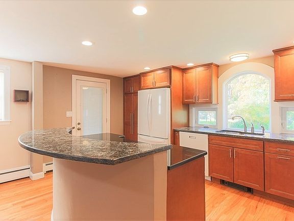 This adorable four bedroom one and a half bathroom Cape with shake style vinyl siding is ready for you! Present owners have lovingly cared for this home for 28 years. Upgraded and remodeled kitchen with custom arched window, granite island, recessed lighting, hardwoods and tons of cabinet space. Kitchen opens up to a fireplaced living room. Two bedrooms and a full bathroom round out the first floor. Upstairs you will find two large bedrooms with a half bath and access doors for extra storage. Recent on demand tankless hot water and boiler combo. Basement has a bonus area, laundry area, workbench and a walkout to the backyard. Breezeway/mudroom entry with slider to deck overlooks the flat oversized backyard great for entertaining! Outdoor storage shed. One car garage. Close to major routes for easy commuting. Don't let this one pass you by!