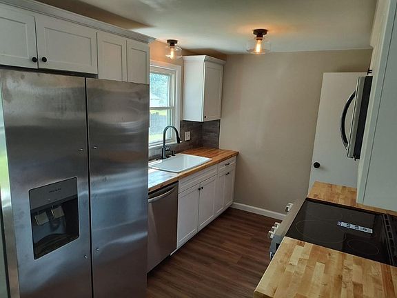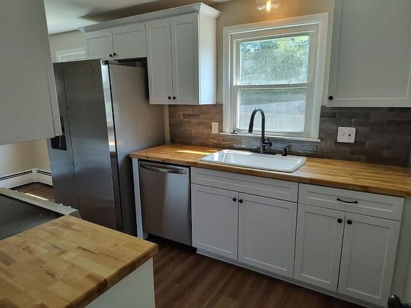 Gorgeous remodeled ranch ready to move in to! Kitchen/dining area combination with new Shaker-style cabinets w/soft-close doors and crown molding, butcher block countertops, tile backsplash, all appliances and laminate flooring. Spacious living room with new picture window & refinished hardwood floors. All 3 bedrooms also feature hardwood floors. Full bath has new laminate flooring, tub, commode, vanity and lighting. There is also a large breezeway/mudroom (unheated) with new flooring. The full basement has a heated finished rec room w/recessed lighting, laundry hook-ups, boiler (2-zone) and 100 amp CB electric. The house is vinyl sided, with replacement windows, newer roof and large fenced backyard for the kids, the pets and the summer barbecues!