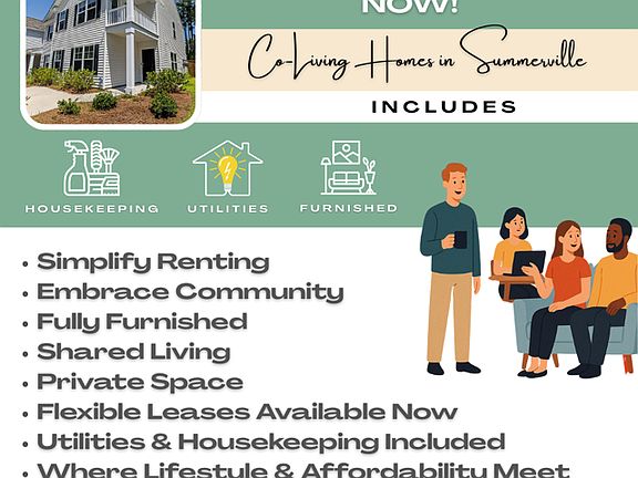 Clean, Safe, and Affordable housing in Summerville! Prime location off Dorchester Rd, close to everything! When you rent a co-living home from By The Beach Annual Rentals, you are welcomed into a shared living environment with respectful, community-oriented housemates. All of our tenants are background-checked and screened to ensure the safety and respect of our current housemates. The townhouse has just undergone some minor renovations and is ready for immediate move in. Shared baths start at $850/month for single occupancy. Private baths start at $1000/month for single occupancy. Safe keyless entry on doors, fully equipped kitchen, and furnished common space! Clothes washer and dryer included! High speed internet/WIFI, utilities, lawn care, trash, and maintenance are included in the rent! PERKS FROM RENTING WITH US: -Nice quiet neighborhood -Convenient location -Utilities included in price (includes high speed WiFi, lawn care, and maintenance. Cable is not provided) -Washer/dryer in unit -Off-street parking -Keyless entry -Furnished common spaces, kitchen equipped WHAT TO KNOW: -Advertised price is for a 12-month lease for single occupancy. -Must pass background, eviction, and credit check -No pets -No smoking -Not a party environment -Flexible lease terms (*price listed is for 12-month lease for single occupancy). We offer shorter terms at increased rates Showing times by appointment only. Deposit due once application approved to secure room. Visit https aboutcoliving.bythebeachproperties. To schedule a showing,