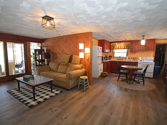 Charming custom home nestled in the trees on 2 acres with small farm pond. Multiple out buildings and fenced in area for the pets or critters make this a lovely spot for country living. Open concept kitchen, living and dining area. 2 first floor bedrooms, large bath with laundry and a spacious second floor primary bedrom with walk in closet. Back deck is enclosed and open front deck as well. Metal roof, vinyl windows, newer laminate floor on first level. Sits off road for privacy and comfort.