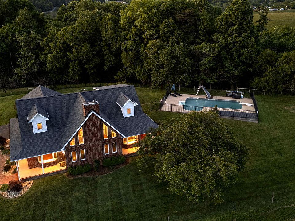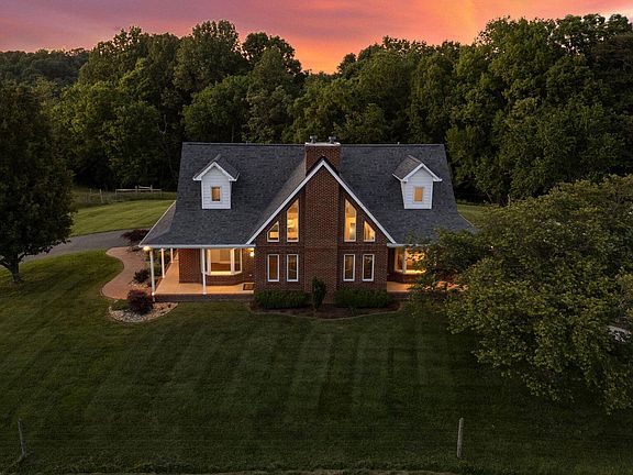 With unforgettable views, this stunning custom brick home on nearly 80 acres offers the perfect blend of privacy and panoramic scenery. The spacious residence, featuring a wraparound porch, includes four bedrooms and five bathrooms, all crafted with exceptional quality. Expansive windows and open living areas highlight sweeping meadows and breathtaking mountain vistas, especially from the cozy stone fireplace. The main level hosts the master suite, a guest bedroom, and a full bath. The chef's kitchen boasts new high-end appliances, including a double oven and six-burner gas cooktop, centered around a striking island with leathered Brazilian quartzite and a farmhouse sink. A large mudroom connects to the garage, which includes a prep kitchen with a sink and smart garage door openers. Upstairs, two ensuite bedrooms feature newly remodeled bathrooms with custom finishes. The partially finished basement offers a gas fireplace, full bath, and versatile space. A large workshop with its own garage door provides ample storage. The land is the true showstopper, with additional access from Old State Route 34. It includes 11 fenced pastures, a well, seven geothermal waterers, a nearly century-old three-story hemlock barn, a metal utility barn, a loafing shed, another metal barn with an attached chicken coop, and an 1,100 sqft brick raised-bed garden. Perfect for entertaining or relaxing, the home features a resort-style saltwater pool with a slide, diving board, and lounge areas. A stamped concrete patio and large fenced backyard complete the outdoor space. This rare legacy property is ideal for a world-class equestrian ranch, exclusive wedding venue, wellness retreat, or a full cattle operation.