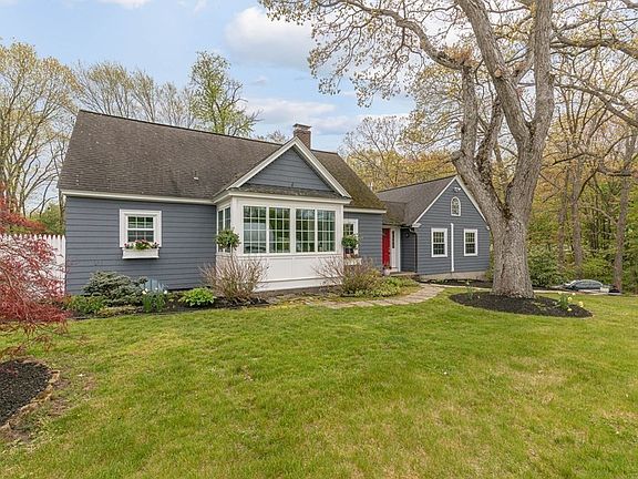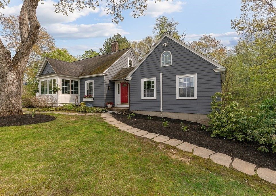 Stunning expanded cape nestled in Boxford's quintessential New England West Village. Highlights of this lovely home include a sun drenched eat-in kitchen with spacious seating area surrounded by windows, a cozy adjacent sitting room crowned by a charming masonry fireplace, a bright open floor plan, custom details, and extensive updates. Expansive windows and a cathedral ceiling illuminate the large, open family room.The primary bedroom suite, complete with an enormous walk-in closet, updated bath, and skylights serves as a cozy retreat. Enjoy the privacy and beauty of the well-designed outdoor spaces that include a babbling brook, wooded area, fire pit, kitchen patio, deck space and a large flat yard with stone walkways and gardens. Sale subject to sellers finding and securing suitable housing.