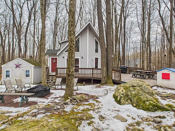 Oversize chalet in amenity filled community, Arrowhead Lake. Home features a nice sized front deck with kids play area and cozy firepit area. Enter into a mud room to remove your ski boots in the winter and sand covered flip flops in the summer. Head into a large combined kitchen/dining area/living room. Wood burning fireplace in living room. Main level also has two bedrooms and bathroom. Head upstairs to a primary bedroom oasis and a generous loft space perfect for relaxing and reading a good book. Lower level has utility/laundry room. Large family/game room decorated for mountain living and a bonus room. Shed on property for outdoor items and lake toys. Home is a short walk or golf cart ride to beaches and pools. Arrowhead head community offers 2 lakes, 4 beaches, , tennis, pickleball, basketball, 3 outdoor pools, gym, library, game room, lake is stocked for fishing, golf carts are allowed. Close to Pocono area attractions - hiking ATV, casino, outlet shopping, waterparks, paint ball. Home comes with most furnishings. Make your appointment today to be in your home to enjoy summer at the lake.
