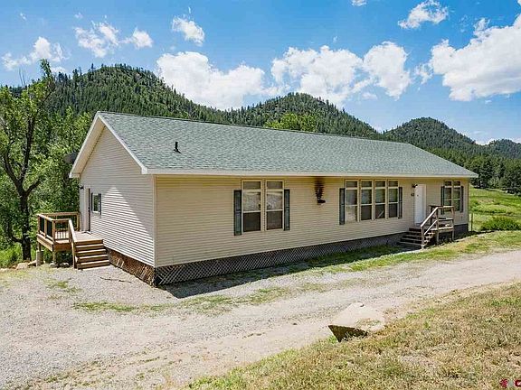 Motivated Seller! Amazing opportunity to live the Colorado lifestyle on this 1,972 square foot, 3-bedroom, 2 bath, Country Home built in 2005, sitting on 10 acres with Bear Creek running through the property! Need more space? No problem! The 1,972 square feet unfinished, walk-out basement can be easily converted into an additional living space. The homeowner recently installed a brand-new carpet in the main living area, and new vinyl flooring in the bathroom. The home offers a large gourmet kitchen built for the chef, a spacious wrap-a-around bar area with lots of seating for friends and family; theres plenty of storage with copious cabinet space, deep drawers, and abundance of countertops. The kitchen is equipped with nice stainless steel appliances. The sliding door leads to the expansive deck with room for grilling, sitting areas, and beautiful views of your new 10 acre property! Located behind the kitchen is a living room with pellet stove, brand-new carpet, and wall of windows, just waiting for you to entertain your family and guests. The private, well-appointed master suite offers walk-in closet, and 5-piece bathroom with a sunken corner garden tub. 2 spacious bedrooms and a full bathroom complete the open concept floor plan. The laundry room with washer and dryer included has a site door leading to the outside. The land surrounding the property has a mix of large Spruce, Ponderosa Pines, Cottonwoods, Oak Brush, and a pasture for livestock and/or perfect for horses! The property is adjacent to the San Juan National Forest, don't wait long because this property won't last!