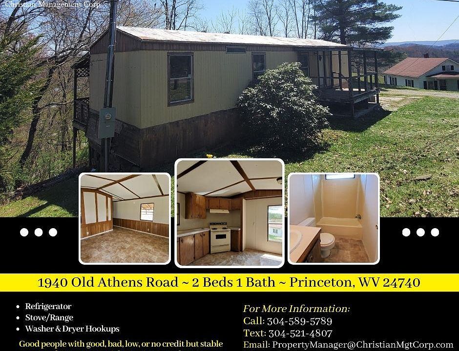 1940 Old Athens Road ~ 2 Beds 1 Bath ~ Princeton, WV 24740 LEASE OPTION: Initial payment: $3,500 with no payments due until the 1st of the following month! Monthly payment: $550/month. No utilities included. or RENTAL: Security Deposit: $550. Can be made in payments if needed. Monthly rent: $550/month. No utilities included. Sorry, this home is not HUD approved. This private 2 bedroom 1 bath singlewide mobile home is available for Rent or Lease Option, located in the heart of Princeton, WV on Old Athens Road moments from Melrose Square and 2 interstate exits. The home features a private driveway, washer & dryer hookups, and full length back porch with great views! Christian Management Corporation Office Hours: M-F 9am-5pm & 10am-2pm the 1st Saturday of every month You can view THIS property 7 days a week! Most pets welcome with a $300 pet fee and signed pet agreement. Maximum 2 pets. No aggressive breeds or outside only animals due to insurance restrictions. Clean, safe, quiet, crime & drug free is our goal. We Support Equal Housing Opportunities! Good people with good, bad, low, or no credit but stable employment or Social Security are welcome. Criminal Checks: -NO recent felonies in the last 7 years -NO evictions in the last 7 years -NO sex offenders Is this property not what you are looking for? View our other available #homes, #mobilehomes, #apartments, and more on our Facebook or our Website.