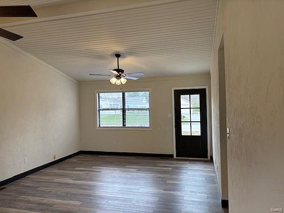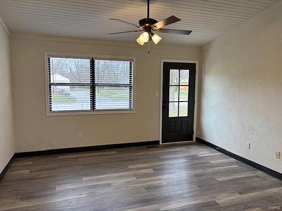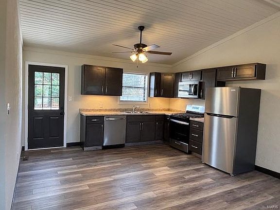 Adorable updated 3 bedroom, 2 bathroom ranch style house updated FALL 2024. A few updates include fresh paint throughout, new flooring throughout, both bathrooms remodeled as well. Vaulted wood plank ceiling in kitchen and living room. New stainless steel appliances in kitchen. Back yard has a vinyl and wood deck which looks out to a large yard with some mature tree's, and an 8x10 shed. 1 block from the Bicentennial Park, 1 mile to Rt 15 and 1.5 miles to BTHS-West. Close to shopping, schools & minutes to downtown STL from RT 15.