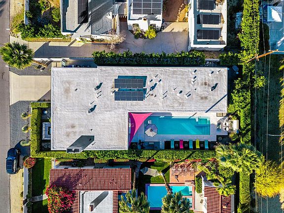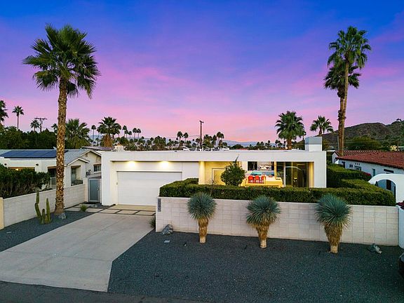 South Palm Springs modern luxury located in Araby & nestled against the Mountains across from the prestigious Smoke Tree Ranch. This striking Solar owned residence features modern linear design oriented to capture surrounding breathtaking wrap around views of the San Jacinto Mountains and extended elevated views of South Canyon. Expansive private living space highlights 10' Fleetwood multi-slide doors that stack effortlessly and anywhere on the track creating seamless indoor-outdoor flow from the private front courtyard to the resort-style backyard. The chef's kitchen offers custom cabinetry and premium DECOR Professional appliances, including a 48' Modernist Series Range and a 48' built-in cabinet style Refrigerator & Freezer, complemented by a Wet Bar, Ice Maker and Beverage/Wine cooler, an extended island with bar top seating adjacent to the dining space with custom chandelier. Great open modern living space with a 60' linear fireplace captures the mountain peaks and starry nights from the Clerestory windows. The primary suite offers an exceptional indoor/outdoor retreat with direct access to the pool & spa with spa like shower, backlit stone wall, and a private outdoor shower immersed in nature. Private saltwater pool & spa with Baja tanning shelf, rock waterfall & raised fire pit area complete the outdoor kitchen w/ concrete bar top seating, BBQ, refrigerator, and sink. Comfortable bedroom separation. Guest bedrooms with private patios, Ensuite, custom showers, vanity, and lighting. Plus, an extra bedroom or office. Custom features throughout, flooring, motorized shades under cabinet lighting, Sonos, a finished garage for parking or as featured game room, with built-in cabinetry, A/C, water softener & tankless water heater and new resurfaced pool patio deck. This is refined desert living come experience the Palm Springs lifestyle.Close to downtown Palm Springs, fine dining, golf, shopping and all the Coachella Valley has to offer!