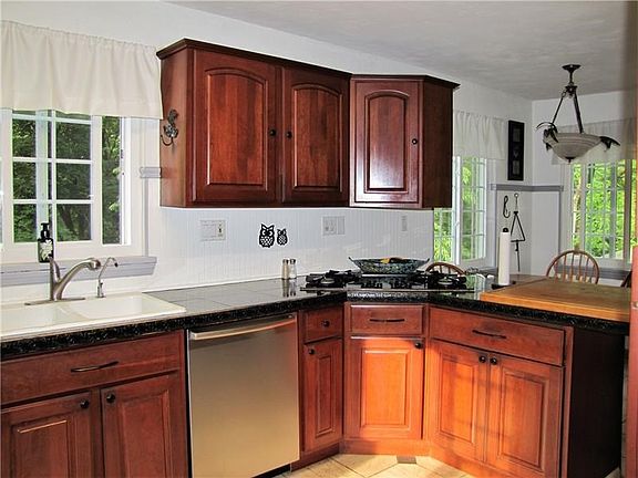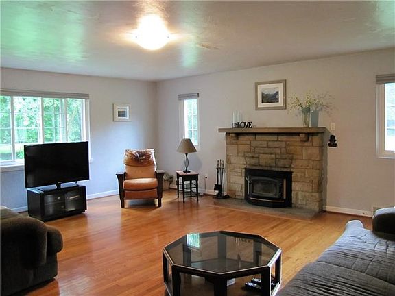 Charming stone home nestled on 4 park like acres provides privacy and convenience with a 30x30 outbuilding, pond, fireplace and large woodshed. Exterior updates include new garage doors (2017), new windows (2017), front and back doors (2018), gutters, downspouts, soffit and facia (2017), roof (2005). Updated kitchen with cherry cabinets and marble tile counters, large living and dining room with built in china closet. Great for entertaining. Spacious bedrooms and den with hardwood floors throughout. New wall to wall carpet on second floor can be converted back to two bedrooms. New furnace (2013), hot water tank (2011) are a few of the interior updates.